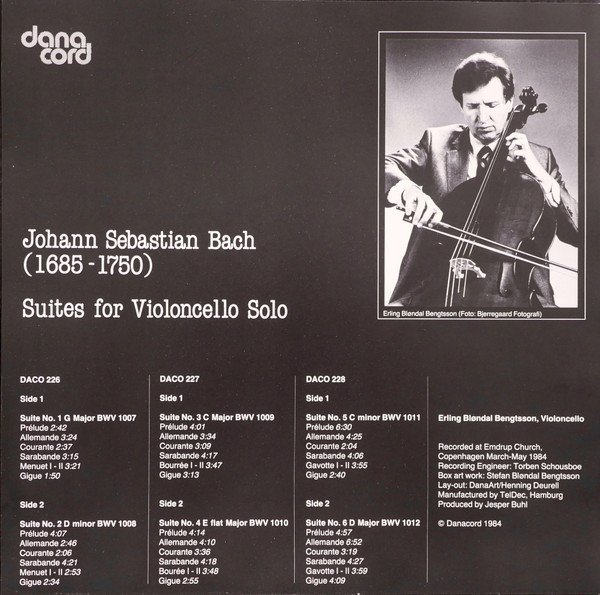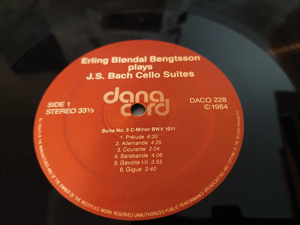 Side 1, 1-6: Suite for solo cello No. 5 in C minor, BWV 1011 [LP: 23:40; CD: 23:36]